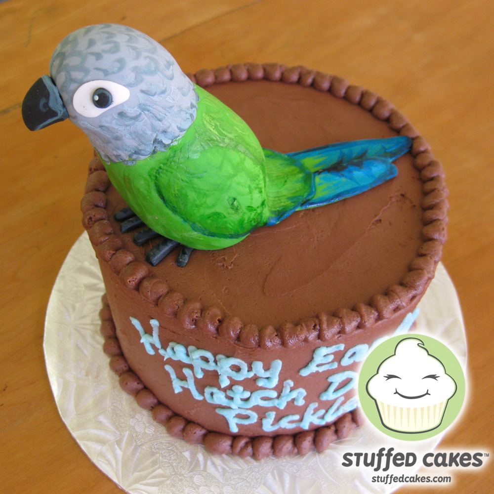 This fun cake was made for Pickle, a dusky headed conure parrot. This lucky bird belongs to Arlene Roth, the winner of Stuffed Cakes' first drawing held at our Grand Opening Celebration. Her hatch day was coming up and Arlene was excited to use her winning cake to celebrate her beautiful bird. Pickle absolutely loved it and couldn't stop looking at her fondant twin. In fact, she kept posing for the camera, which we were told she normally hates.